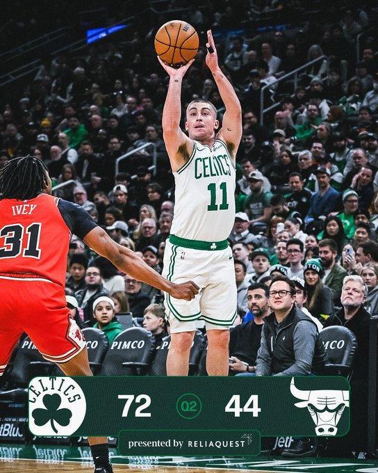 次節(jié)比賽,凱爾特人連續(xù)兩節(jié)單節(jié)得分35+,且用出色防守限制公牛首次單節(jié)不足20分。凱爾特人持續(xù)攻防碾壓公牛,率先打出一波21-6攻勢,已經擴大57-33領先24分優(yōu)勢。凱爾特人之后繼續(xù)擴大70-41領先優(yōu)勢,公牛略有反撲追分,上半場結束凱爾特人擴大72-44領先公牛28分優(yōu)勢。前兩節(jié)比賽,凱爾特人48中28接近6成準星,其中三分19中10,布朗18分、普里查德16分與武切維奇10+6;公牛三分17中6,全隊沒有球員得分上雙。