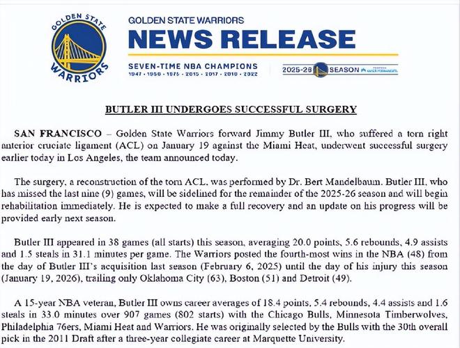 北京時間2月10日,金州勇士隊今日宣布,球隊前鋒吉米-巴特勒于今日早些時候在洛杉磯成功接受手術。巴特勒在1月20日對陣邁阿密熱火的比賽中右膝前十字韌帶(ACL)撕裂。